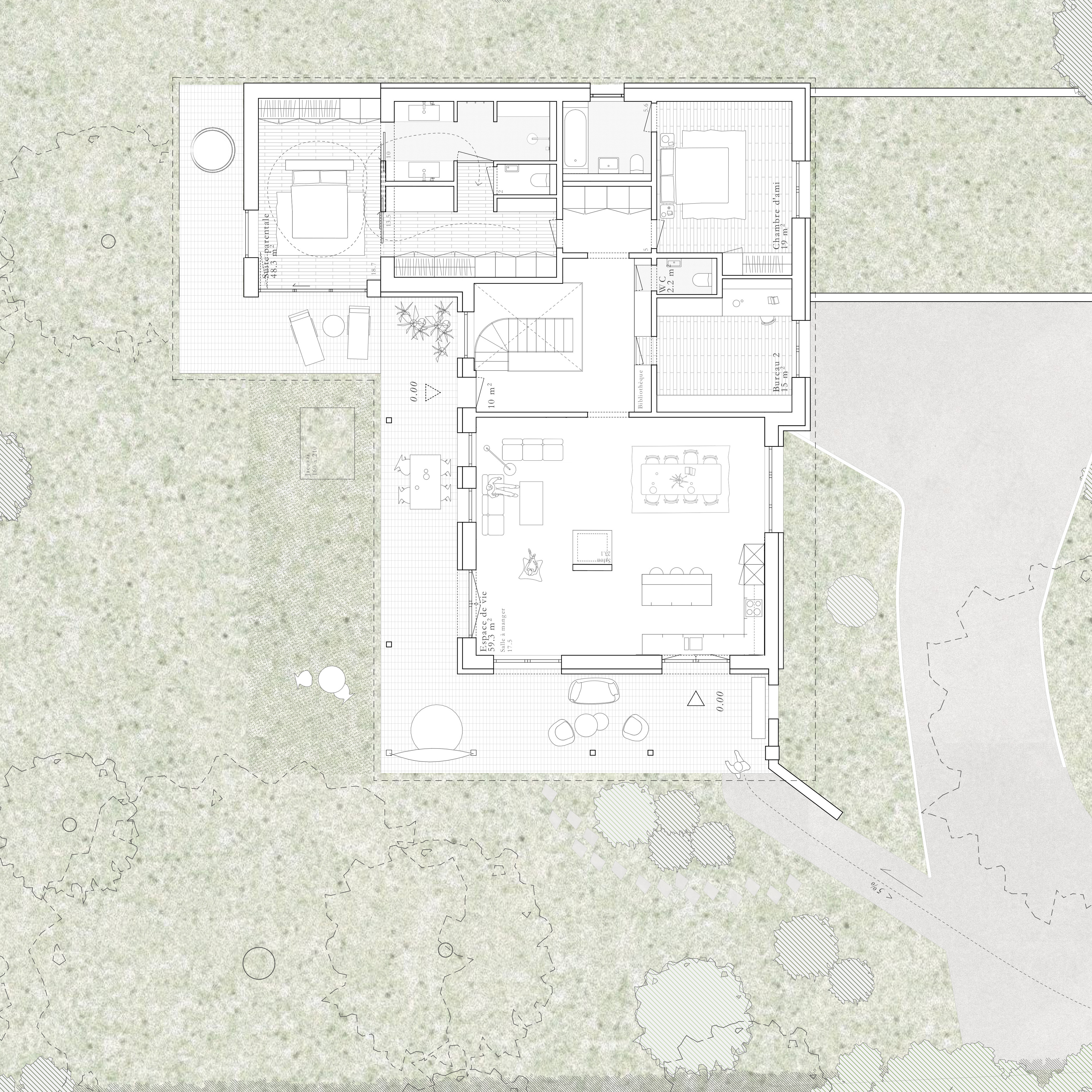 L’ensemble du projet s’inscrit dans une écriture sobre et intemporelle. Une palette de matériaux naturels — bois de noyer et de chêne, pierre, acier — compose une atmosphère harmonieuse et durable, où l’architecture accompagne les gestes du quotidien et le passage du temps.